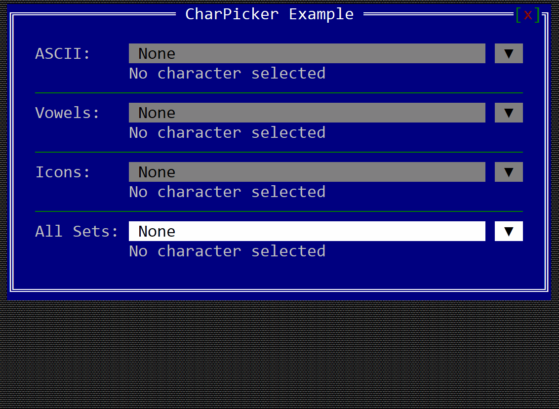 ![]() | Char Picker * Code: examples/charpicker * Description: A CharPicker is a UI control in AppCUI-rs that allows users to select a single character from a wide range of Unicode sets, such as ASCII, box-drawing and line-drawing symbols, arrows, geometric shapes, emoji, and other predefined or custom character groups, presented in an expandable panel for easy browsing and selection. |