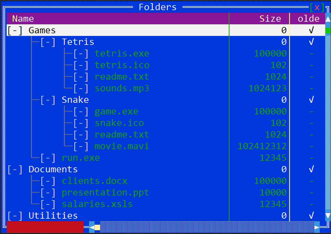![]() | Tree Viewer * Code: examples/treeview * Description: A simple tree view wth 3 columns where you can navigate, select, sort, filter, fold and unfold items. |