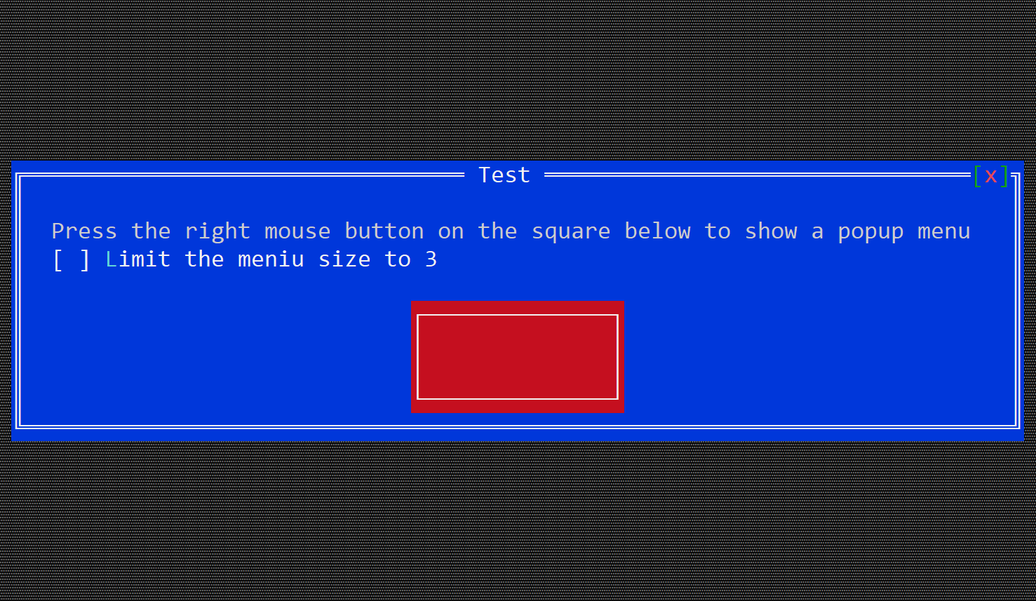 ![]() | Popup Menu * Code: examples/popup_mnu * Description: The popup menu is a menu that is displayed when the user right clicks on a control. You can control the size of the menu and interact directly with the menu items. |
